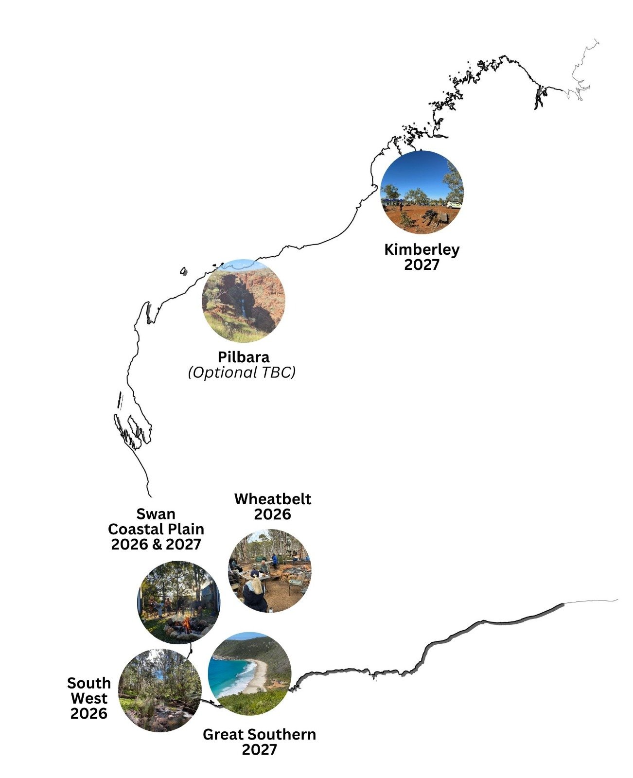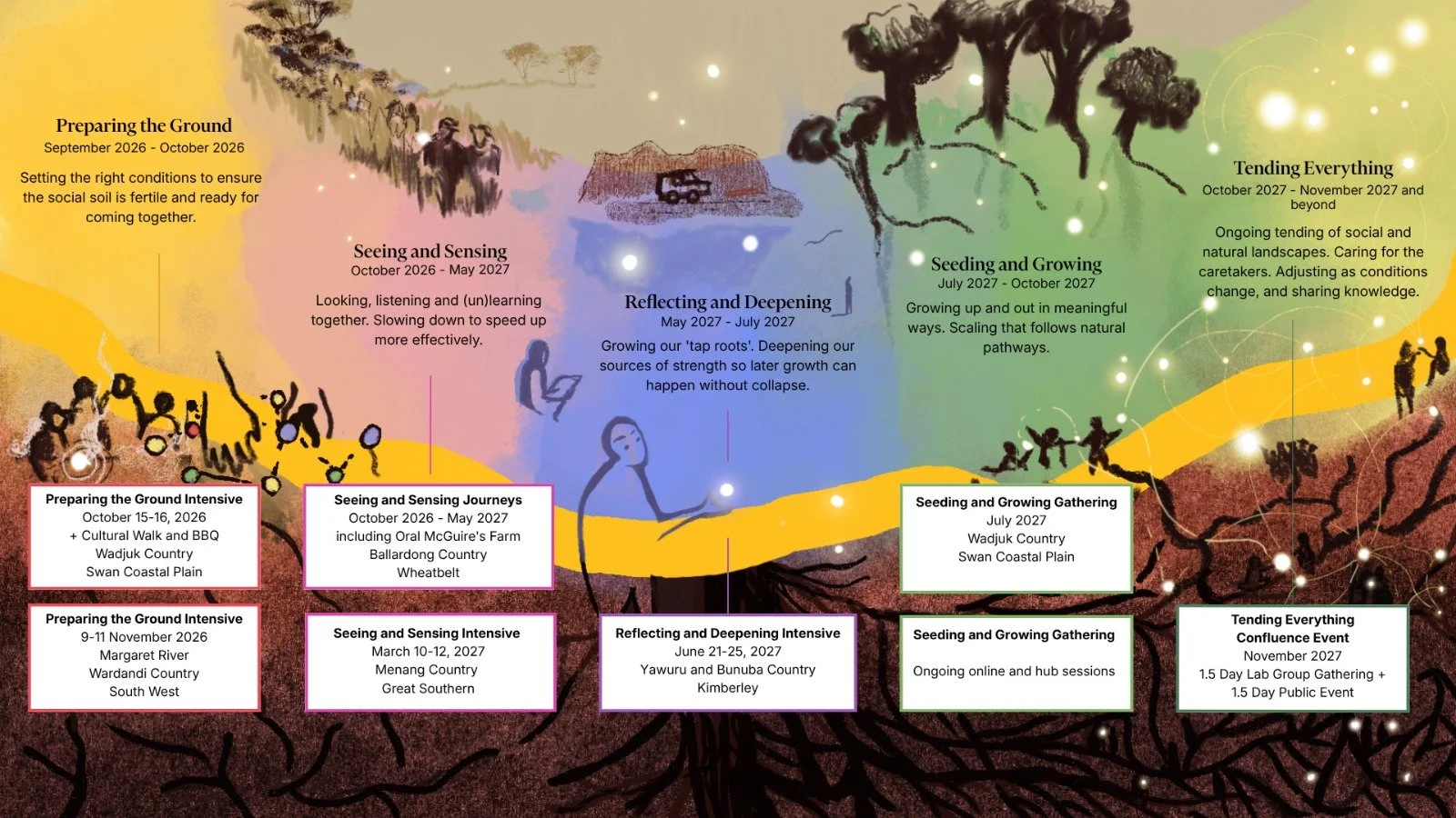As part of a steady-moving journey, a core group of around 45 movement builders and network connectors (plus team) will be hosted by individuals and organisations in places where holistic landscape restoration and caring for Country are already taking place. These include hosts in the Swan Coastal Plain, Margaret River area, the Great Southern, the Wheatbelt, the Kimberley, and the Pilbara (optional TBC). In all these places we will not only collectively observe, listen and learn from our hosts, but will also strive to listen to and learn from landscapes themselves, thereby encouraging healthy spirit, land, people and economies, and the restor(y)ing of nature and human beings through implementing further changes, at different levels, in our various areas of work. The lab will therefore be a kind of moving experiment and exhibition—Western Australia as laboratory and studio—where we will explore existing restorative activities, and also implement future work that is waiting for us to do it.